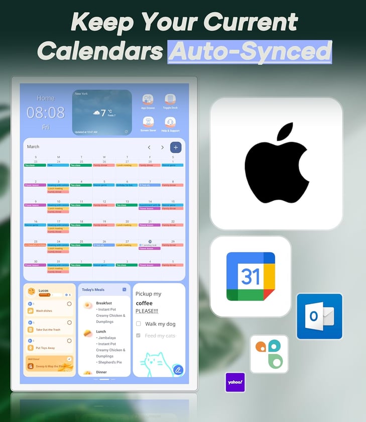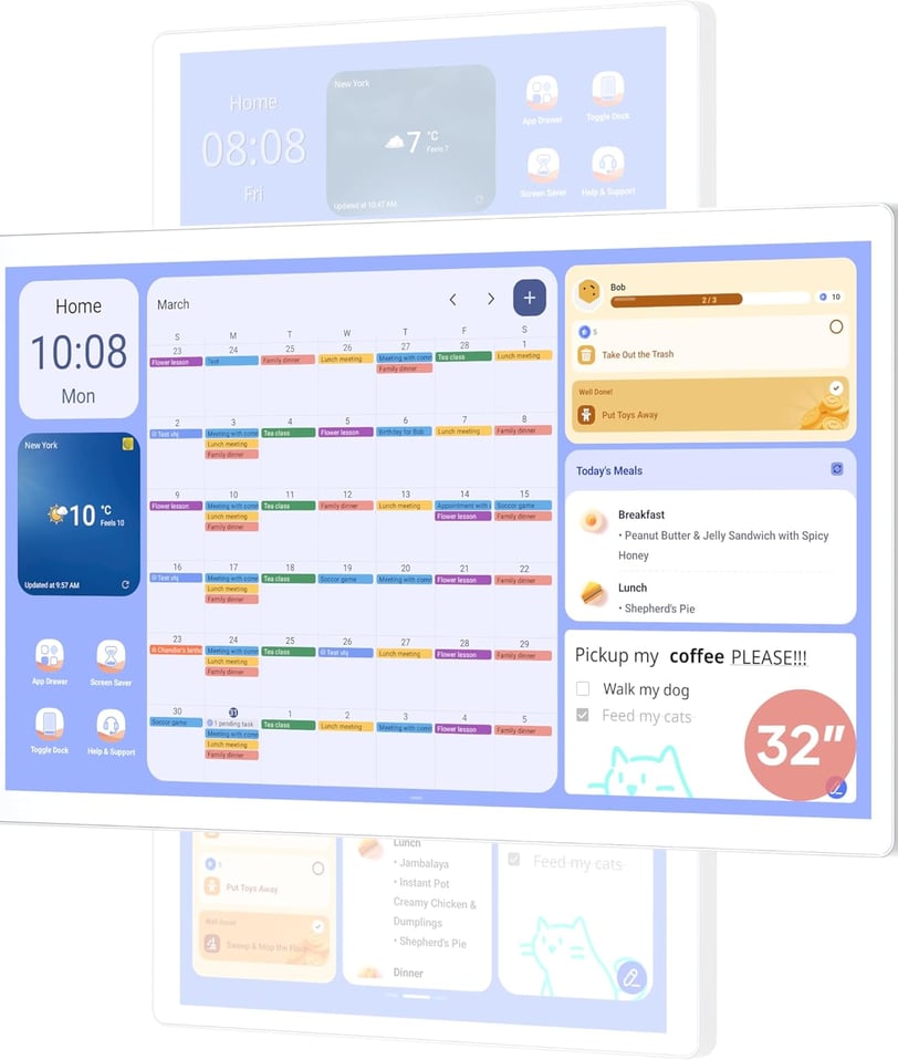The Cozyla 32" Digital Calendar Wall Touch Screen offers a range of standout benefits. Its large, vibrant display makes it easy for the entire family to see schedules and tasks at a glance. It syncs seamlessly with Android apps, allowing integration with tools you already use like Google Calendar, To-Do lists, recipe apps, and more. The interactive chore chart and meal planner encourage responsibility and healthy routines for both kids and adults. Its modern, wall-mounted design blends beautifully with any décor, adding both function and style to your home. Plus, it enhances communication, keeps everyone organized, and significantly reduces stress and daily confusion.