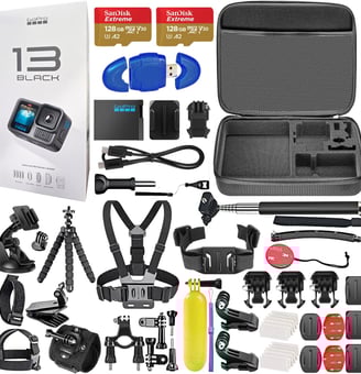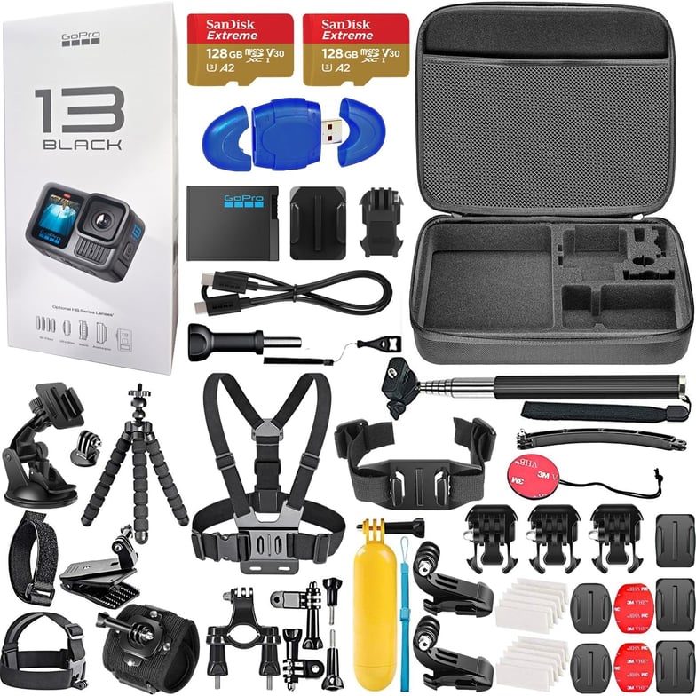 The GoPro HERO13 Black with 2× 128GB cards and 50 accessories is one of the most value-packed bundles available today.