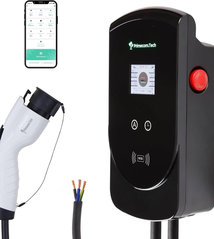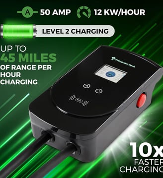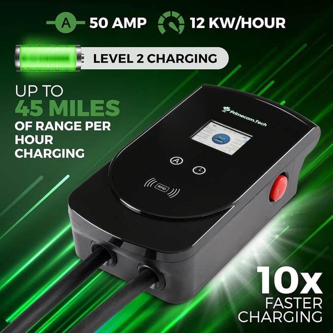 Charge your EV 7x faster with the PRIMECOM.TECH 50A Smart Level-2 EV Charger. 50ft cord, Wi-Fi control & universal compatibility for Tesla & all EVs.